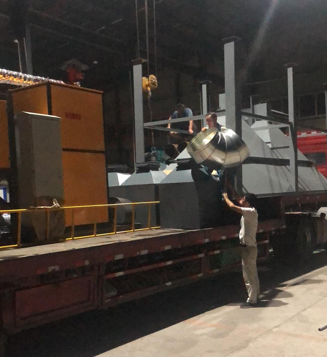 昨天下班以后物流過來提貨了,發(fā)走一套除塵器,催化燃燒設(shè)備一套,引風(fēng)機(jī)等,裝貨到很晚。布袋除塵器型號是DMC-360型,催化燃燒里面的過濾箱,吸附床,冷風(fēng)機(jī)等設(shè)備整套發(fā)走。